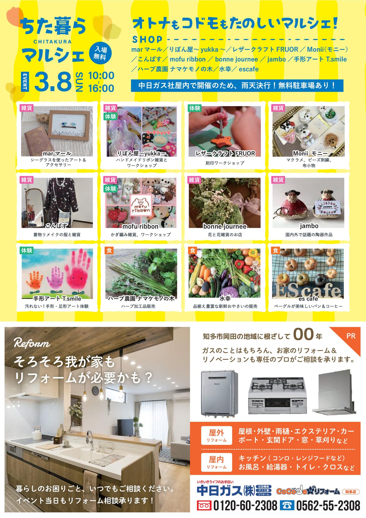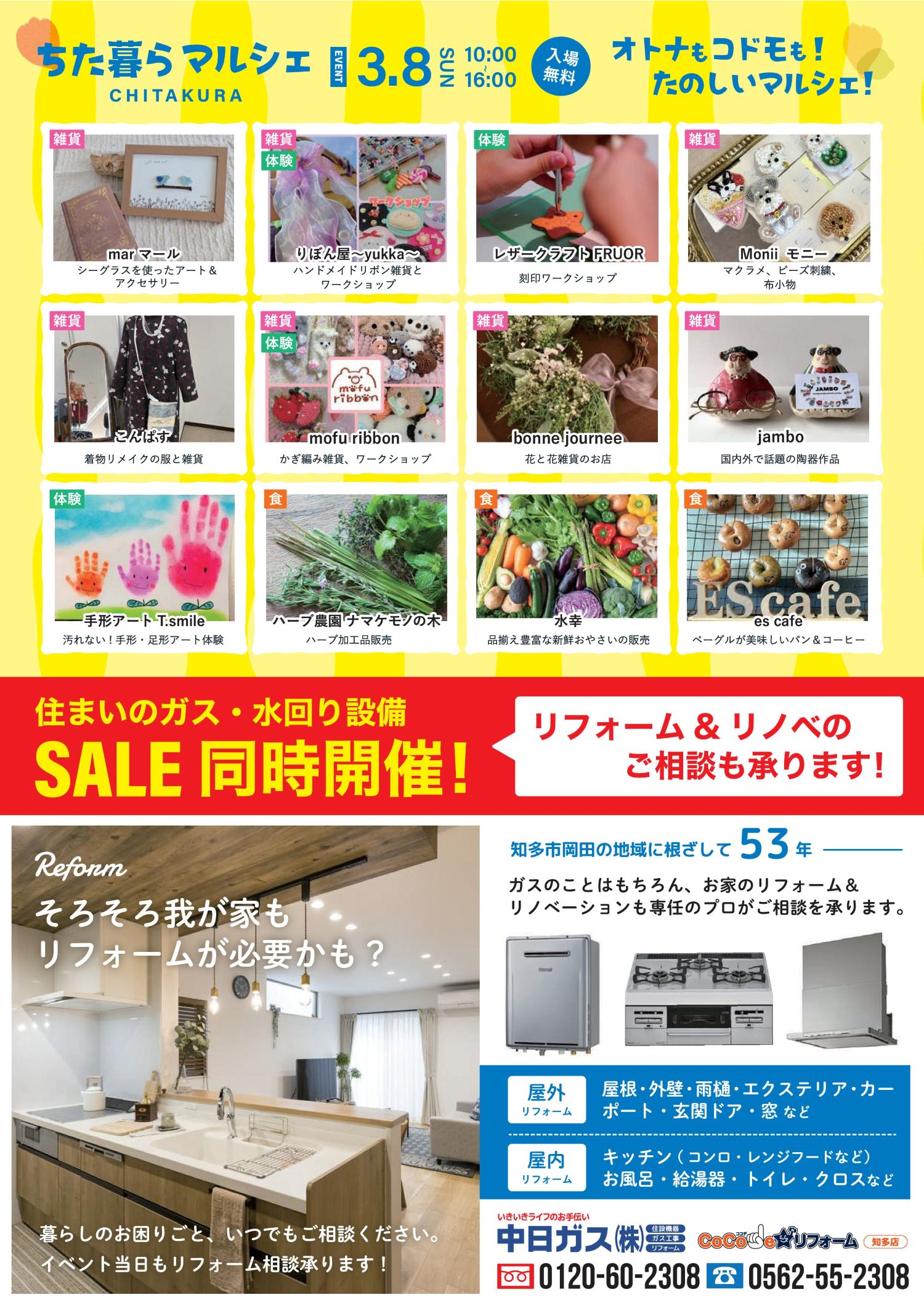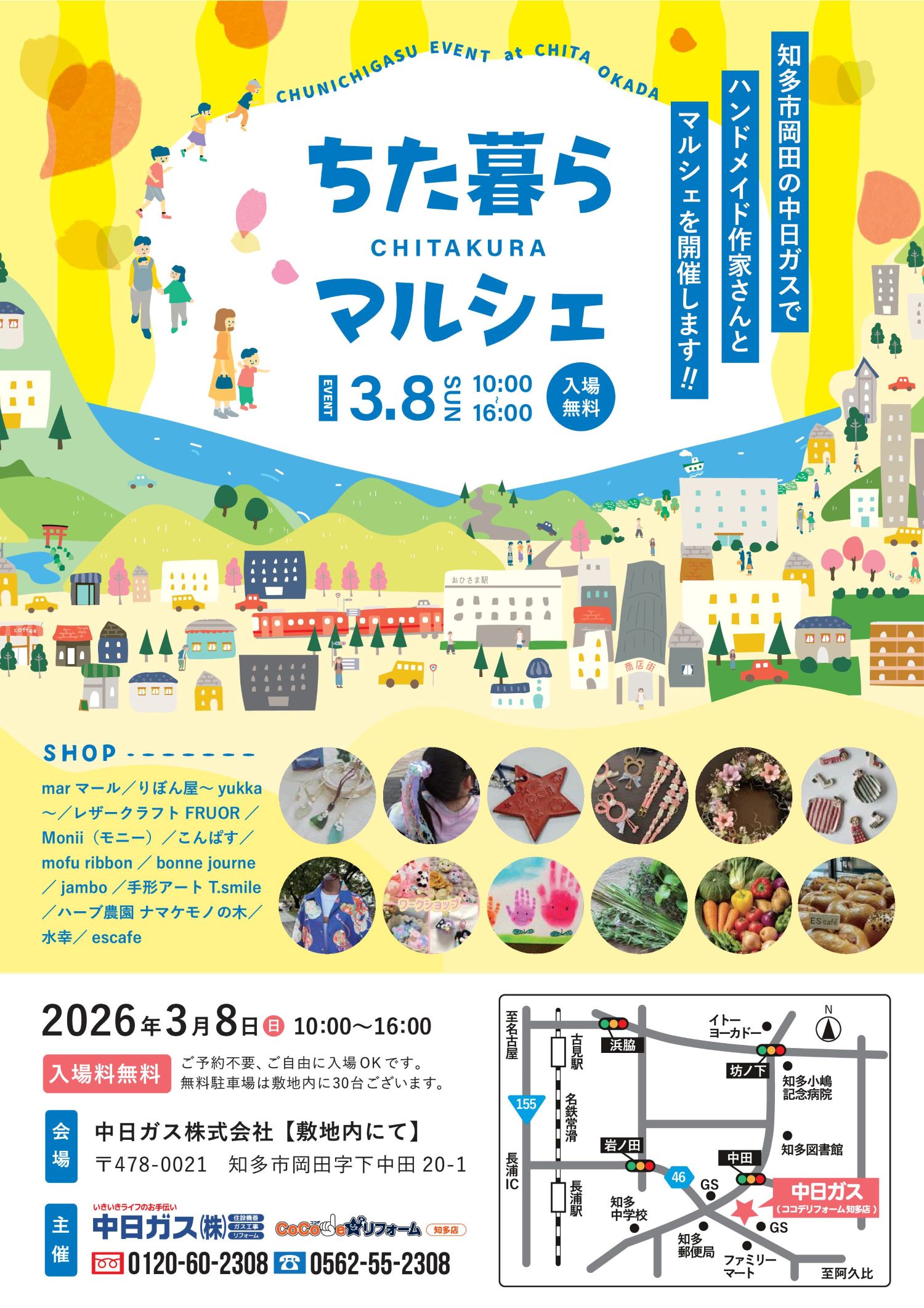 当社にて、地域のみなさまにお楽しみいただける「ちた暮らマルシェ」を開催します。ハンドメイド作家さんの雑貨販売やワークショップ、美味しいフードなど、大人も子どもも楽しめる内容が盛りだくさんです。